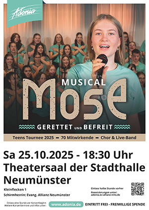 Im Oktober führt Adonia im Theater der Stadthalle Neumünster das Musical ‚Mose – gerettet und befreit‘ auf. Das Besondere daran: Die Teens üben das Musical innerhalb von 4 Tagen ein und sind anschließend vier Tage lang auf Konzerttournee. Während der Tour übernachten die Mitwirkenden in Privatquartieren.